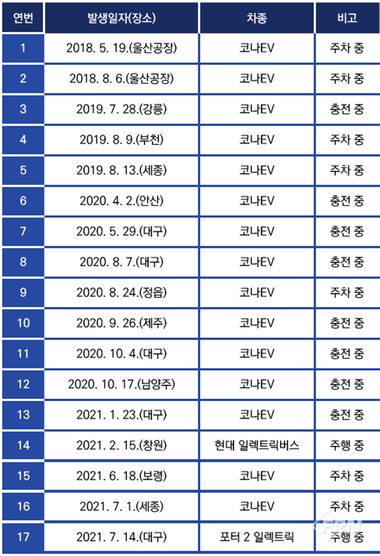 ![]() ▲ [표 1] 국내 전기자동차 배터리 화재 현황(2021년 7월 기준) |