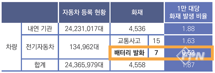 ![]() ▲ [표 3] 내연 기관 자동차와 전기자동차 화재 발생 비교 |