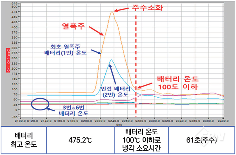 또 배터리 온도를 분석한 결과 모두 열 폭주가 진행됨이 확인됐습니다. 화재는 발생하지 않았지만 다량의 오프 가스가 방출됐습니다. 이 가스는 가연성+조연성이므로 만약 점화원이 있었다면 폭발을 동반한 화재가 발생했을 것으로 판단됩니다.