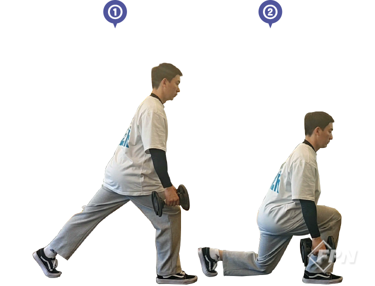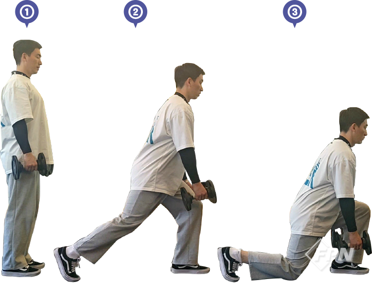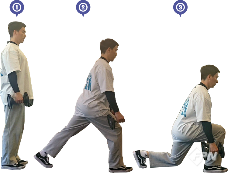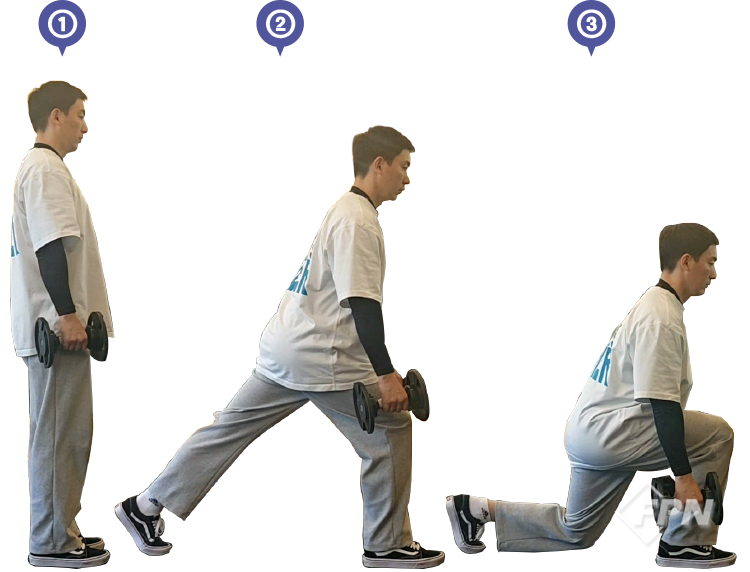 런지가 몸이 앞으로 나왔다가 뒤로 빠지면서 진행한다면 백 런지는 반대로 몸이 뒤로 빠졌다가 앞으로 나오면서 운동하게 됩니다. 운동은 ①~③번으로 진행되며 덤벨을 앞으로 모아주는 게 중요합니다.