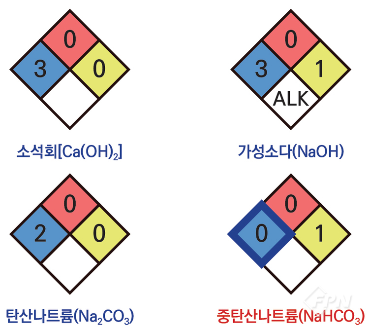과일의 잔류 농약 제거를 위한 세척 용도, 친환경 산성토양 개질 용도, 위산과다 제산제, 빵을 구울 때 부풀게 하는 베이킹파우더의 성분인 ‘중탄산나트륨’의 NFPA 704 건강 위험성은 안전(단계 ‘0’)하다([그림 6] 참조).