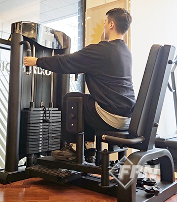 2. 이때 핀 블록 앞쪽에 있는 손잡이를 잡고 허리는 곧게 편 상태에서 엉덩이가 앞쪽으로 나와 앉도록 합니다.