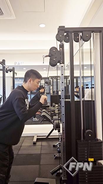 2. 이때 또한 상체는 최대한 고정하고 팔만 최대한 끝까지 신전해 삼두근의 자극을 최대로 높이도록 노력합니다.