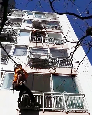 현장에 도착하니 아이가 10m 높이의 에어컨 실외기 위에 앉아 난간을 붙잡고 있었다. 발을 헛디디거나 실외기가 무게를 못 견뎌 무너지기라도 하면 자칫 지상으로 떨어질 수도 있는 상황.