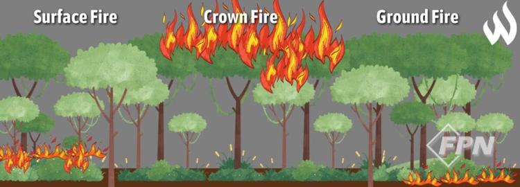 ![]() ▲ 산불은 세부적으로 특성에 따라 더 다양하게 구분할 수 있다. 하지만 대표적으로 표면을 타고 이동하는 지표화재(Surface Fire)와 통상 V 패턴으로 성장하는 수관화재(Crown Fire), 땅속에 숨어서 이동하는 지중화재(Ground Fire)가 있다. 그 밖에 줄기를 따라 이동하는 수간화재(Stem Fire)나 비산도 있다(출처 wfca.com/wildfire-articles/wildfire-temperatures-how-hot-can-wildfires-burn/). |