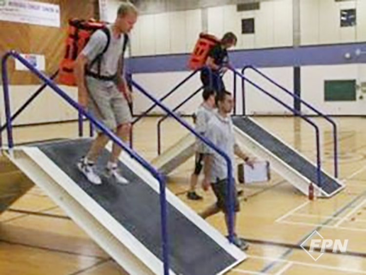 1m 높이에서 28.5㎏의 펌프모형을 등에 메고 출발선을 통과하면 시간 체크가 시작된단다. 총 160m(40m 4바퀴) 동안 등에 펌프를 메고 20m마다 35°, 1.22m 경사를 통과해야 해. 그 후 두 번째로 모형펌프를 손에 들고 80m(40m 2바퀴)를 운반하지.