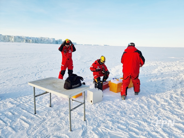 우린 기지에서 500m가량 떨어진 해빙 위로 설상차를 타고 진입해 장비를 내렸다. 작업준비는 순조로웠다. 설상차를 운전해 온 중장비대원은 작업과정을 영상장비로 촬영하겠다며 카메라를 설치했다. 해양대원은 작업 선반을 펼쳐 블루투스 스피커를 연결해 음악을 틀었다. 봄 소풍을 온 듯한 분위기가 연출됐다.