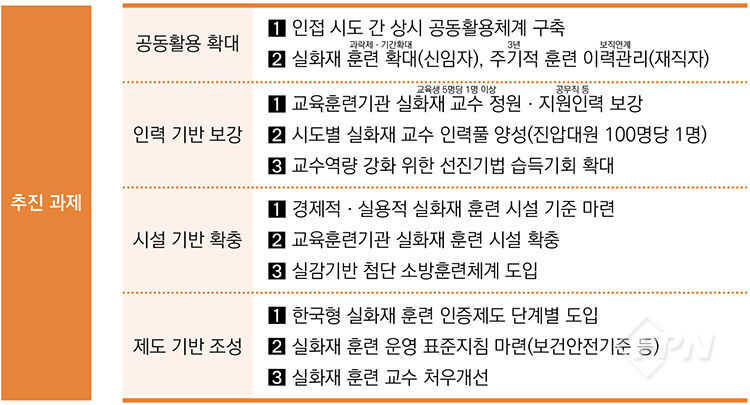 ![]() ▲ 실화재 훈련 강화 추진 기본 계획의 추진방향과 과제(출처 소방청 자료) |
