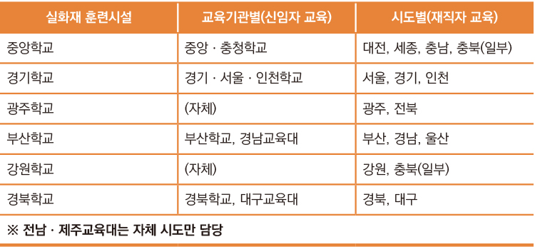 교육훈련 기관 중 중앙소방학교와 경기, 강원, 광주, 부산소방학교, 전남소방교육대 등 6곳 정도가 현재 실화재 훈련시설을 갖춰 놓은 상태다.