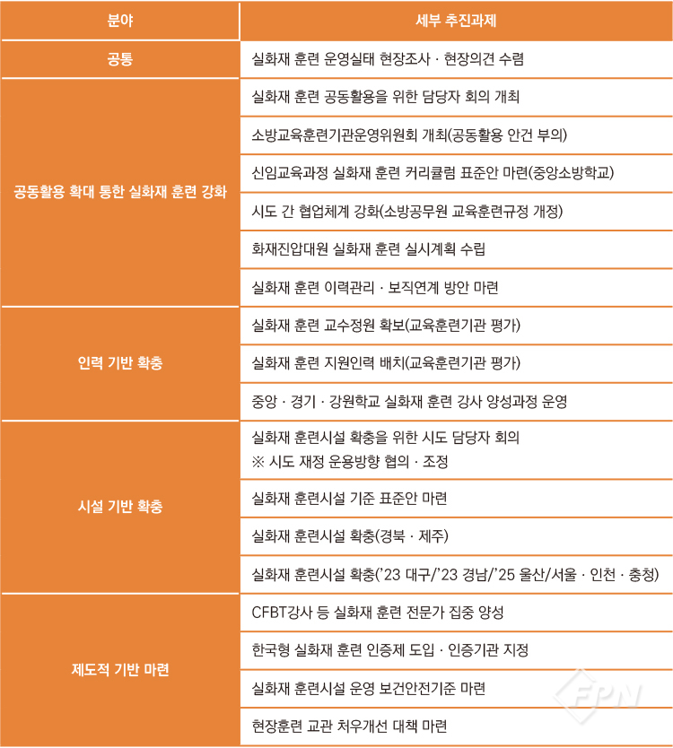 ![]() ▲ 실화재 훈련 기본 계획 세부 추진 과제(출처 소방청 자료) |