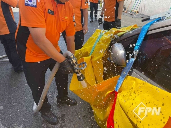 [FPN 정재우 기자] = 평창소방서(서장 서강원)는 5일 본서 차고 앞에서 화재진압대원과 구조대원을 대상으로 전기차 배터리 화재 대응 특별훈련을 실시했다고 밝혔다.