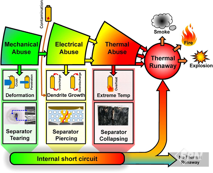 ISC(내부 단락)는 [그림 1]에서 볼 수 있듯이 TR의 가장 일반적인 특징이다. 거의 모든 오용 조건은 ISC와 함께 발생한다. 광범위하게 말해서 ISC는 배터리 분리막의 손상으로 인해 양극과 음극이 서로 접촉할 때 발생한다.