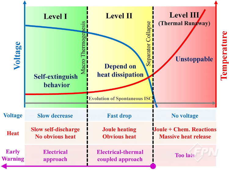 ISC의 위험 수준은 자가 방전 속도와 예상치 못한 열 발생으로 평가될 수 있다. 현재 문헌을 요약하면 [그림 2]와 같이 세 가지 수준의 ISC를 제안한다.