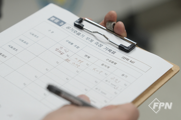 ![]() ▲ 실증 당일 한국소방산업기술원 관계자가 공기호흡기 무게 측정하고 그 결과를 기록했다. © FPN |
