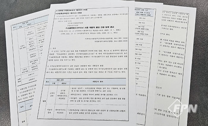 ![]() ▲ 이달 초 기후에너지환경부와 산업통상부가 공고한 '수소불화탄소 사용 제품의 물질 전환 일정 공고 © FPN |