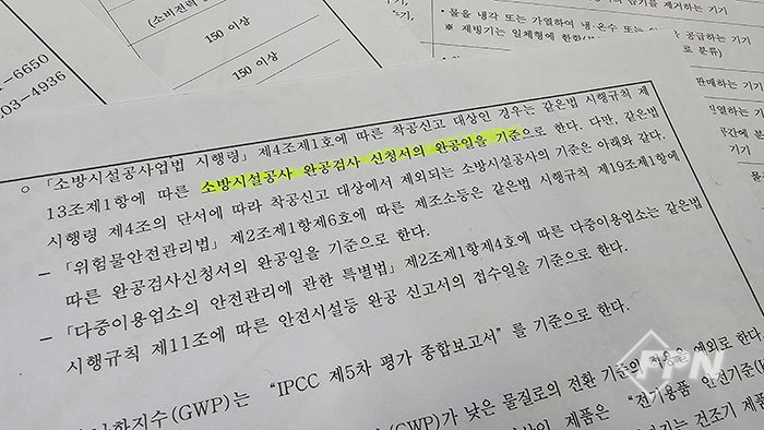 공고에 담긴 전환 시기 적용 기준도 논란에 휩싸였다. 공고문에선 물질전환 대상이 되는 가스소화약제를 신축 건물 등 착공신고 대상에 적용할 때 ‘완공검사 신청서의 완공일’을 기준으로 삼도록 규정하고 있다.