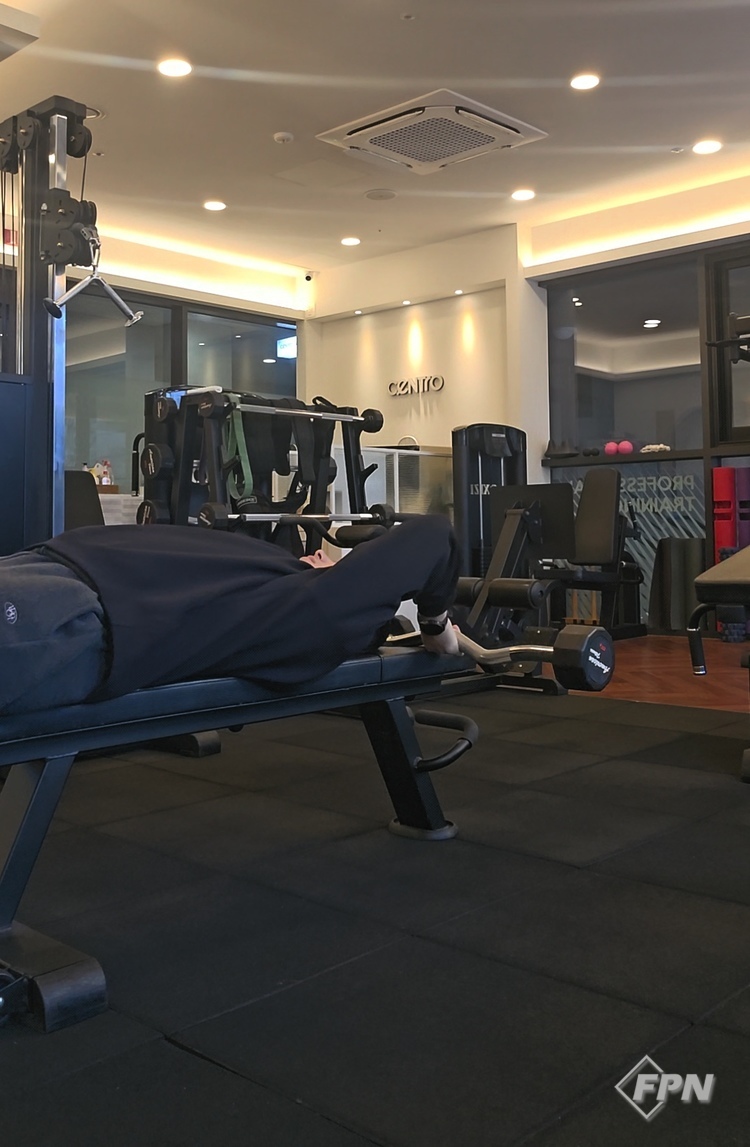 4. 바벨 컬이 끝나면 바벨을 내려놓고 상완삼두근 운동인 라이닝 트라이셉스 익스텐션을 진행합니다.
