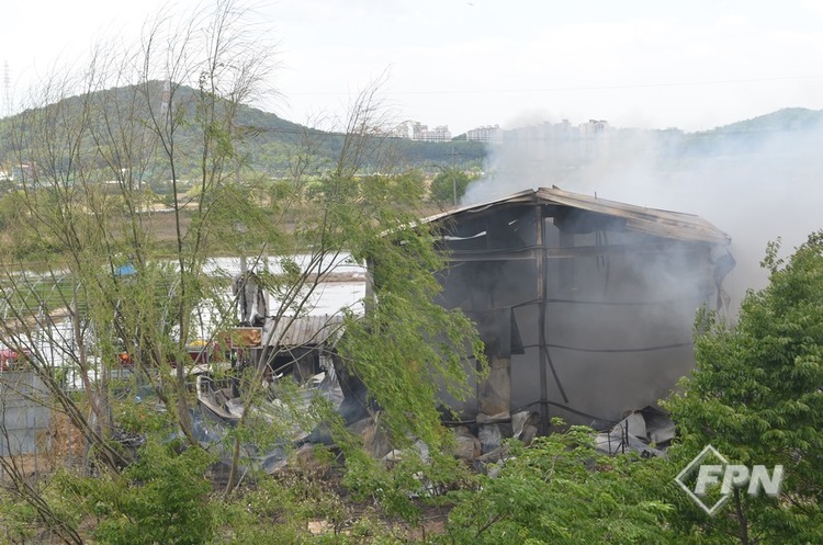 OO코리아 정면으로 샌드위치 패널 구조의 창고가 전부 연소하고 있다. 화염에 의한 복사열이 크게 작용해 소방차도 현장을 약간 지나쳐 부서했다. 샌드위치 패널 건축물은 연소가 시작되면 급격하게 연소되고 전소된다. 내부에 종이상자와 가연물이 있어 연소 확대가 가중됐다.
