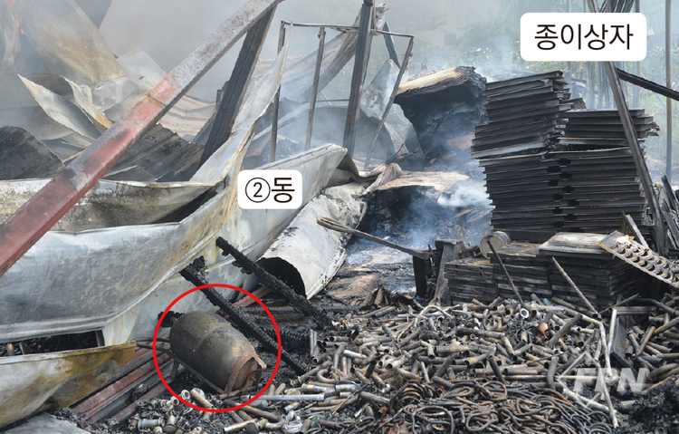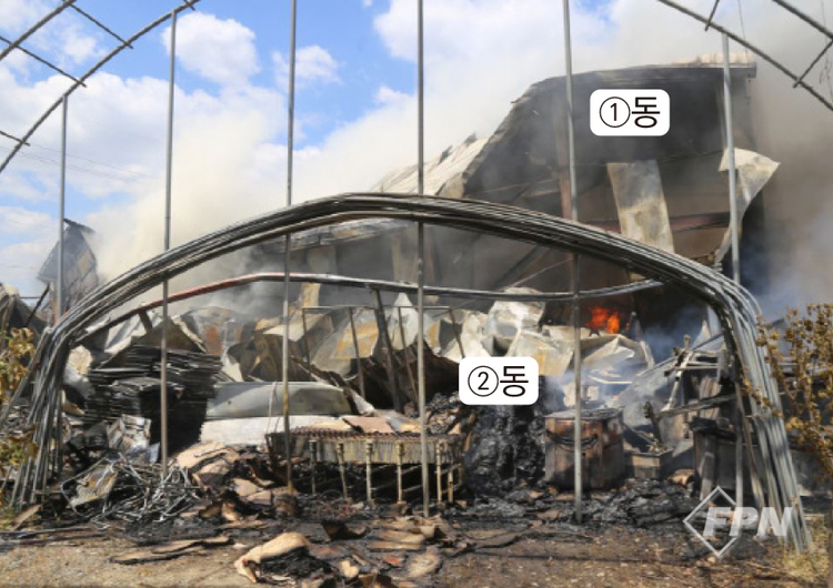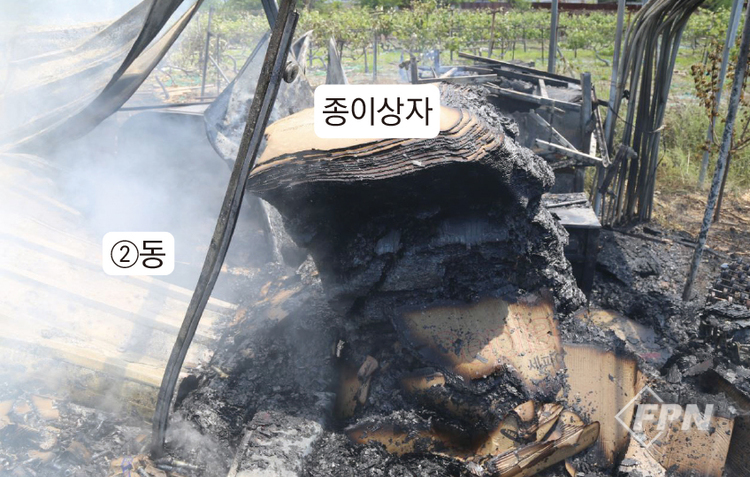 창고 뒤편 종이상자 더미가 쌓여 있던 건물 ②동은 창고동으로 일부 종이상자가 탄화해 잔류해 있었다. 창고동은 뒤에서 출입할 수 있는 출입문이 없다. 탄화 흔적도 종이상자 부근 비닐하우스 철제파이프 하부에서만 발견됐다.