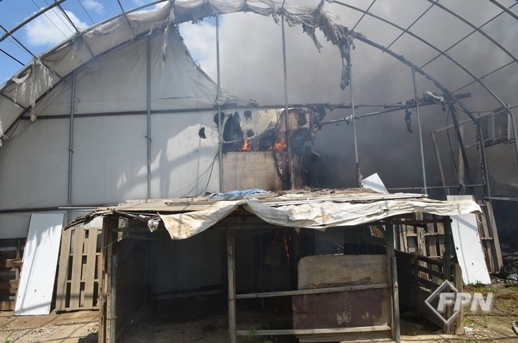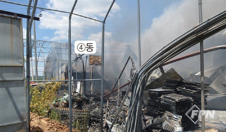 건물 ④동 창고 뒤편 비닐하우스 일부가 연소 중이었다. 다른 장소와 비교했을 때 가장 늦게 연소 중임을 알 수 있었다. 즉 비닐하우스는 연소 피해 건물로 발화지점과 인과관계가 없다.