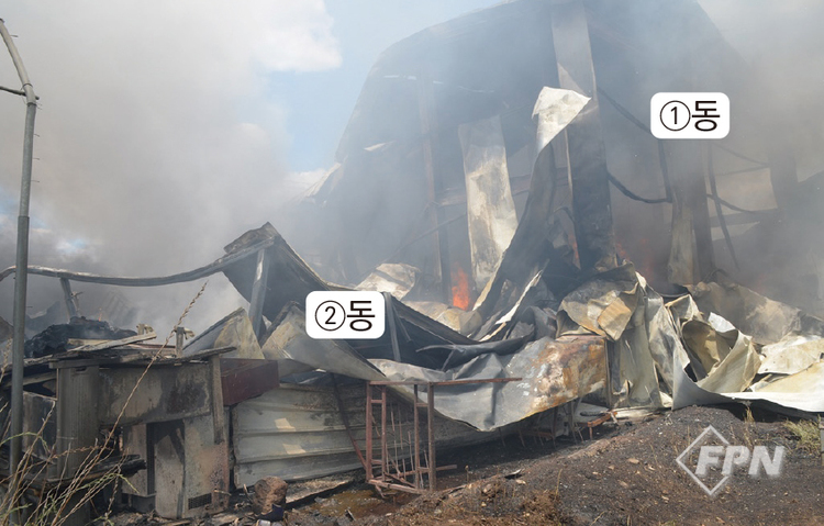건물 후면인 창고 뒤편은 철골조만 앙상하게 남아 있었다. 비닐하우스에서 OO코리아 건물 방향으로 소훼도가 집중돼 있었다.