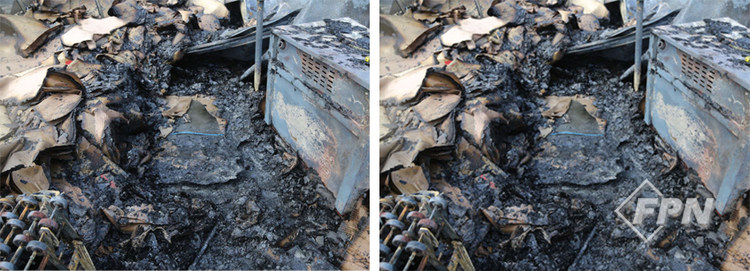 종이상자를 쌓아놓은 부분을 바닥까지 발굴하니 바닥은 탄화하지 않았다. 종이상자를 받치고 있던 플라스틱에는 연화ㆍ탄화한 방향이 잔류했다. 잔류한 플라스틱 용융 방향이 밴딩기를 향하고 있었다.