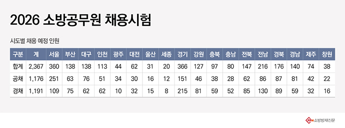 소방청(청장 직무대행 김승룡)은 5일 이 같은 내용이 담긴 ‘2026년 소방공무원 채용시험 시행계획’을 국가공무원 채용시스템(gongmuwon.gosi.kr)을 통해 공고했다.